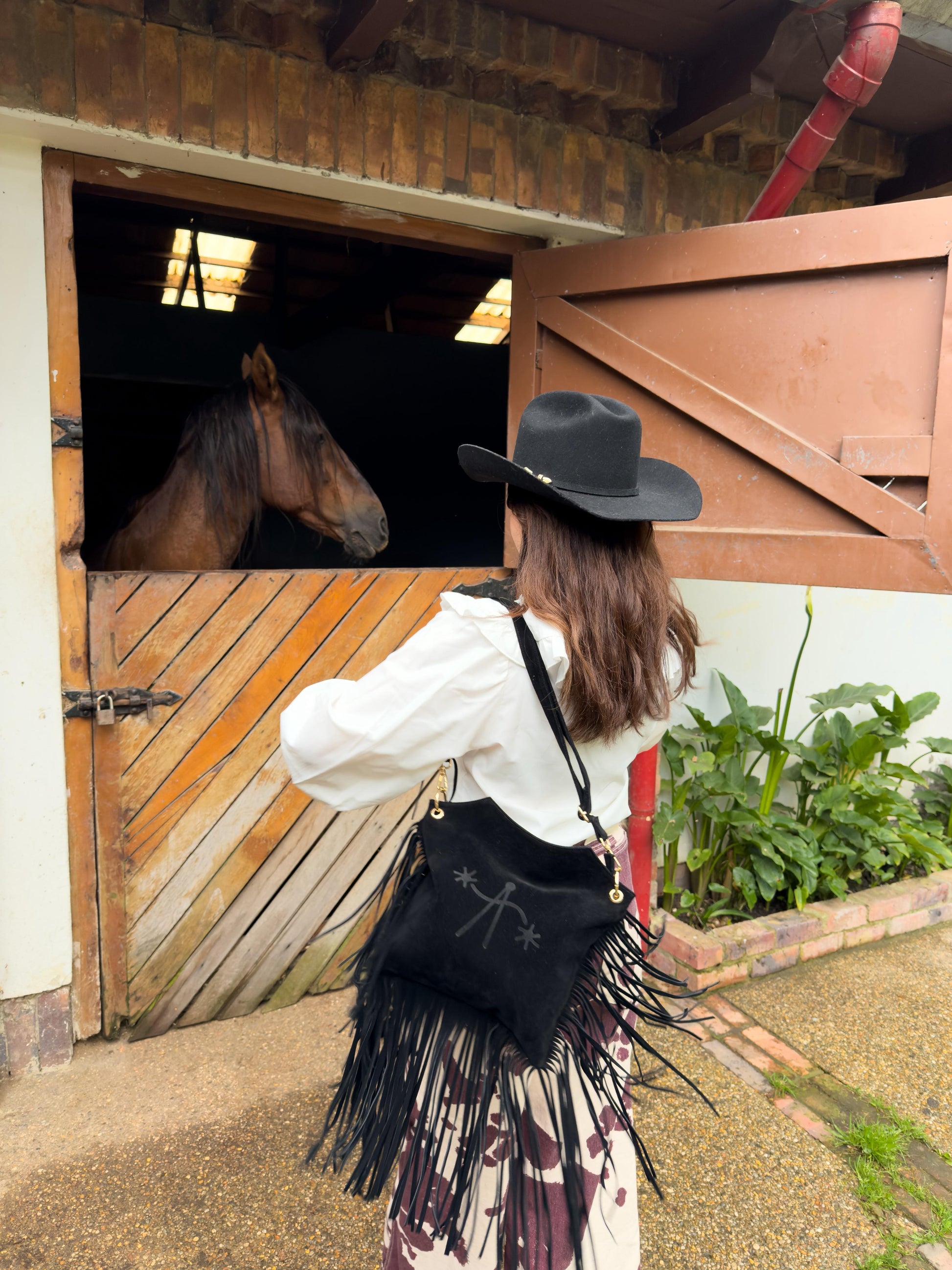 Un bolso sofisticado y con presencia, hecho en cuero no animal tipo carnaza, para mujeres que dominan la noche y brillan con fuerza propia. Los flecos te llenan de poder.