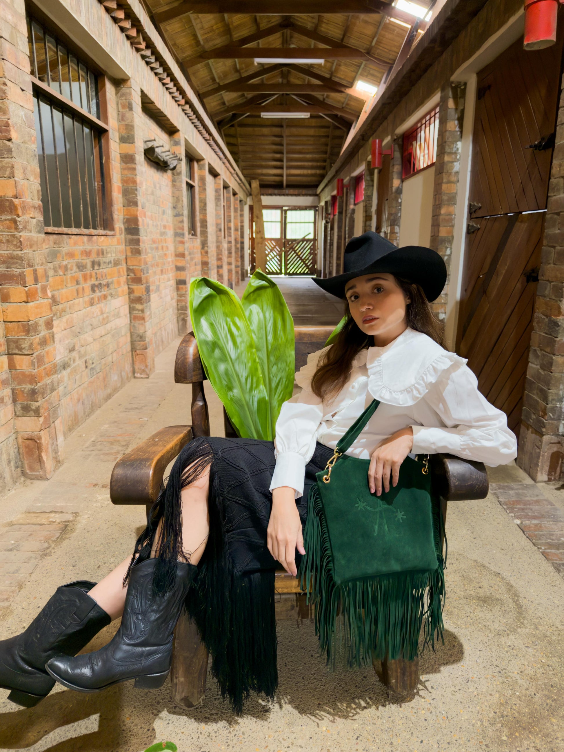Un bolso en tono verde oliva que conecta con la naturaleza, perfecto para mujeres que sienten el llamado del bosque y la tierra. Este diseño con flecos celebra la belleza y vitalidad del bosque.